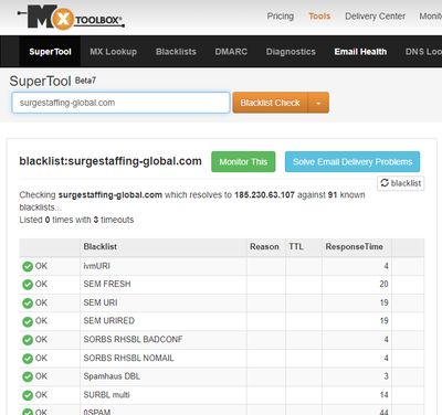 Lets check this by going to https://mxtoolbox.com/blacklists.aspx and checking both the .info and the .com address The results of this test interesting show that the .com was fine but the .info was blocked by a couple of sites.