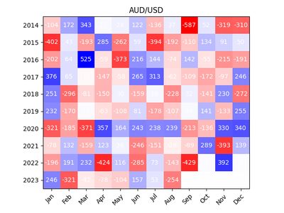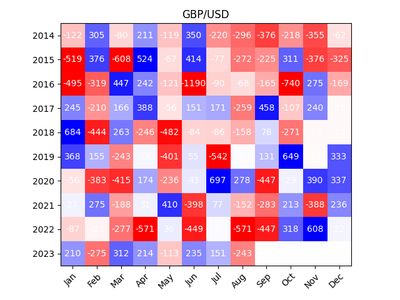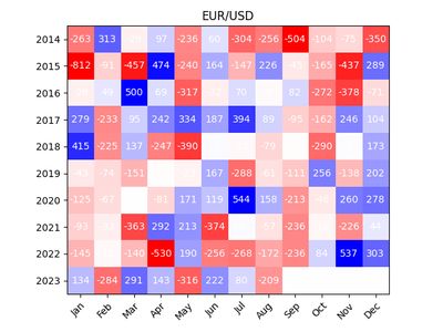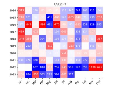Could there be something in this? Do other markets have similar trends? I wanted to investigate more. I ended up coding a small program to get the open prices for each month of the major currencies against the USD and then computed the number of pips that increase or decrease over the course of the month.
