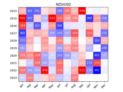 The NZD tends to decline against the USD in the month of August. September continues the decline or drifts sideways.